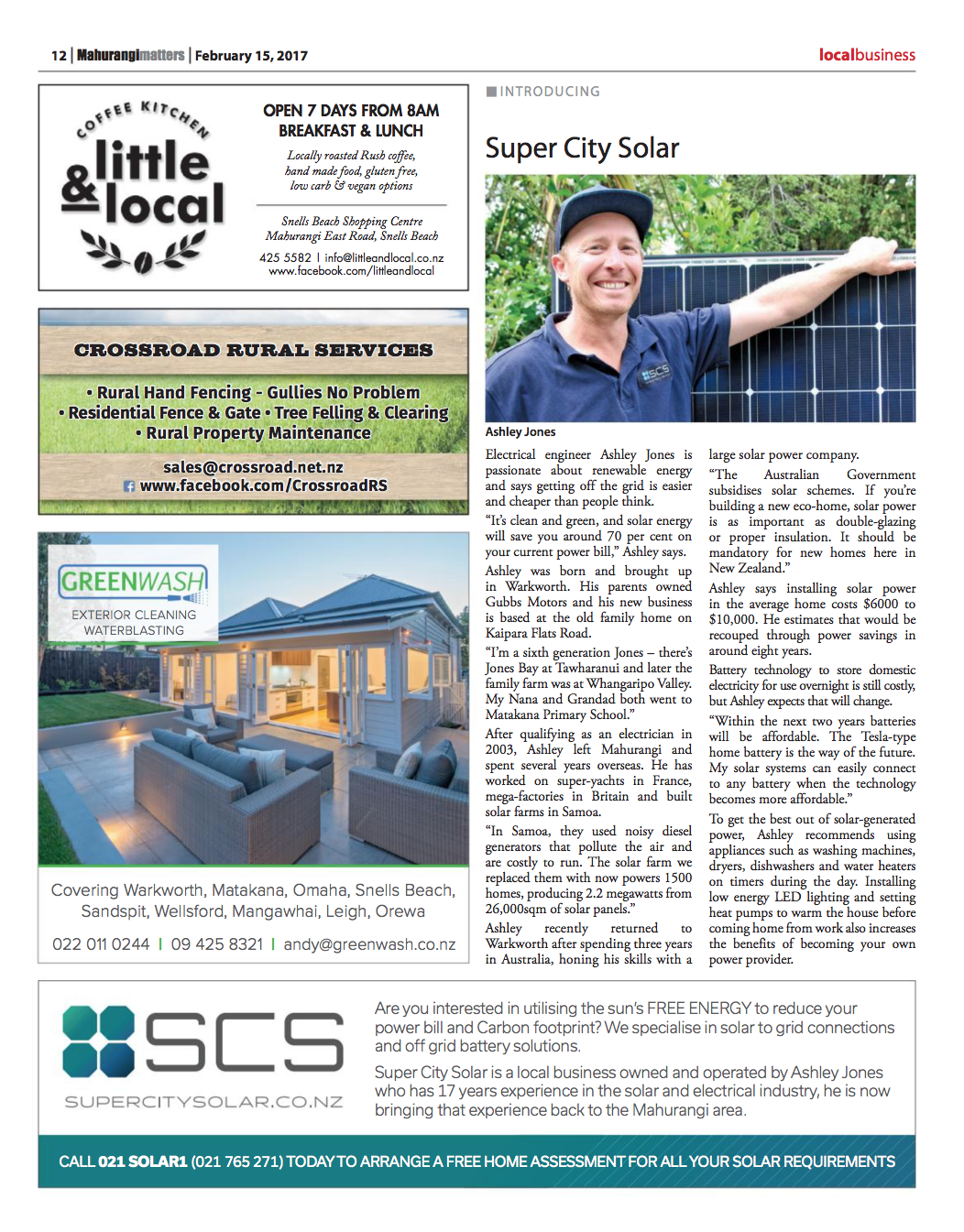 Ashley returned to his home town of Warkworth, now the base of Super City Solar, servicing Auckland, Rodney, and Northland districts.